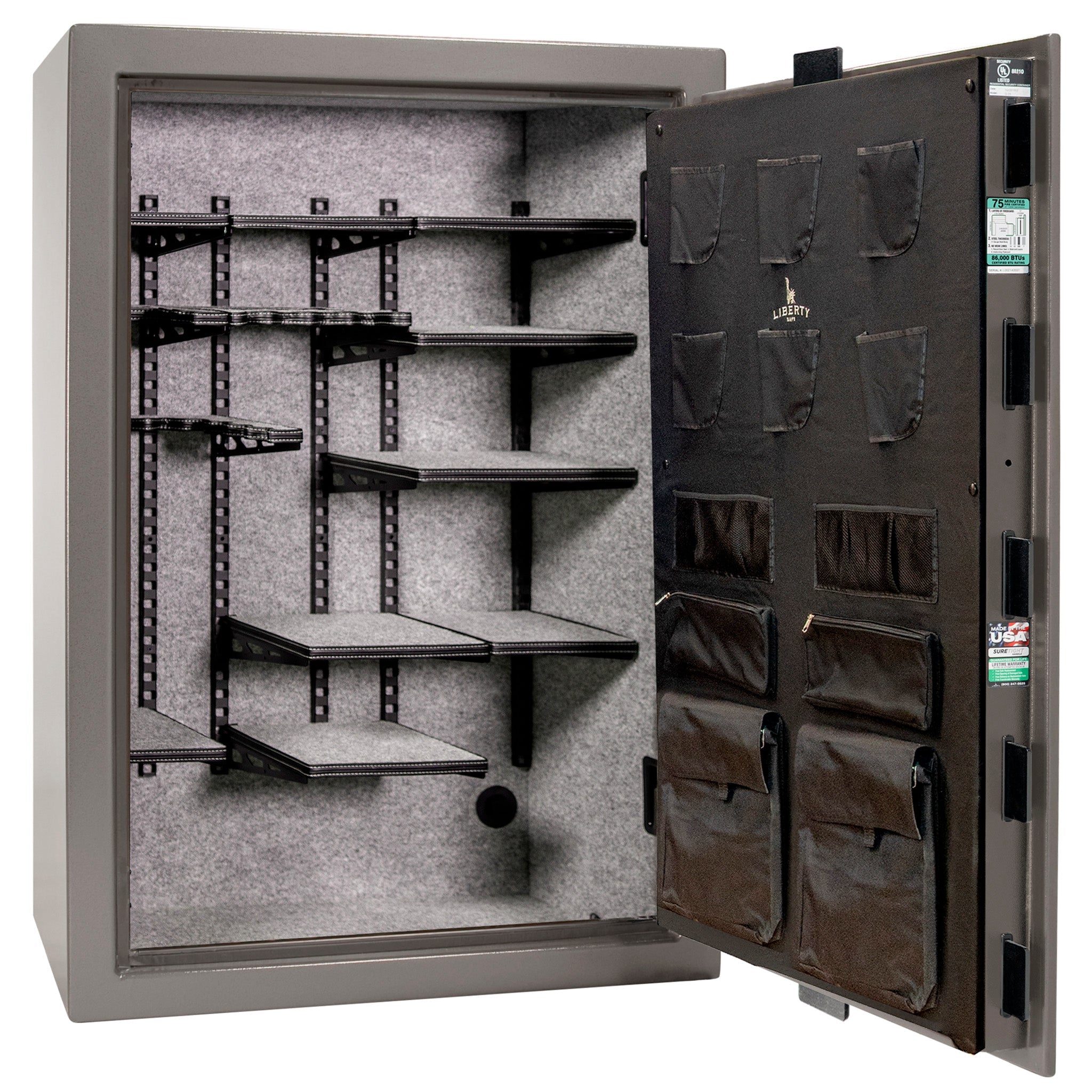 The Colonial Pro Flex™ designed with an all-new modular shelving system is an ideal mid-level gun safe for those who prefer a fully customizable interior. Featuring ¼" Solid State™ locking bars and a full 75 minutes of Cool Box™ fire protection at 1200°F, the Colonial offers higher security, better fire protection, and is also available in additional interior configurations, including our fully upholstered, 3-in-1 Flex™ adjustable interior and a 6-in-1 Flex™ adjustable interior for the Colonial 50 Extreme.